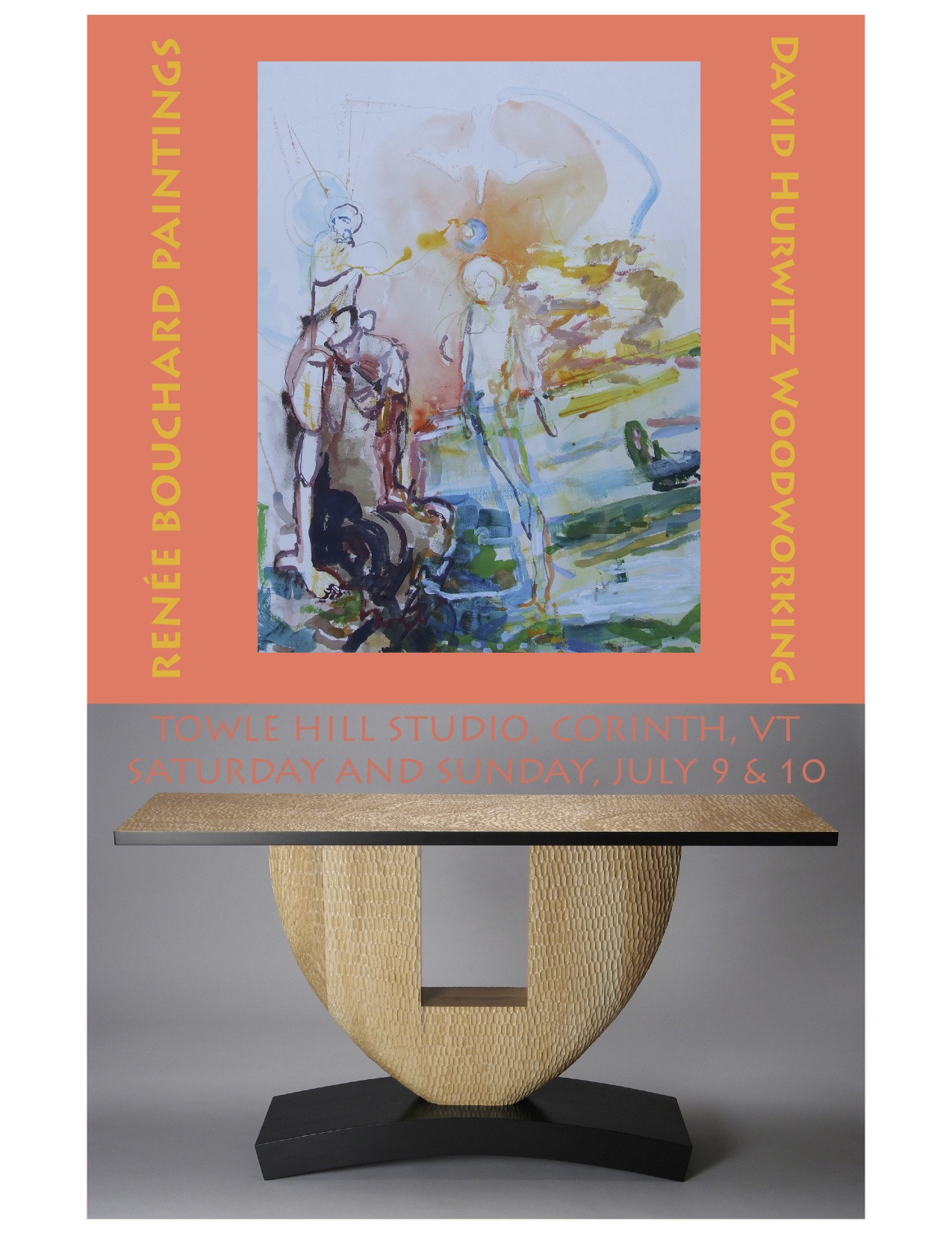 I’ve been meaning to post some photos from a gallery exhibit I did in July. I showed my handmade furniture with paintings by my friend Renee Bouchard of Bennington, Vermont at Towle Hill Studio in Corinth, Vermont.