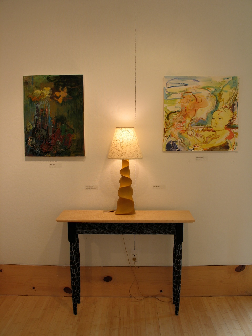 Cherry and Ash Console Table and Cherry Taffy Lamp; paintings left to right: Thaw; No Birds, No leaves, No Sun, November!